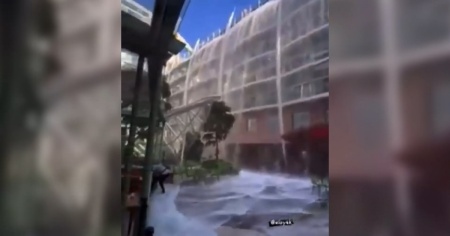 Nel video si vede il momento in cui la massa d'acqua fuoriuscita si riversa lungo i ponti sottostanti. Fortunatamente, la virata ha avuto l'esito sperato e né gli occupanti della zattera, né i passeggeri della nave hanno riportato conseguenze.