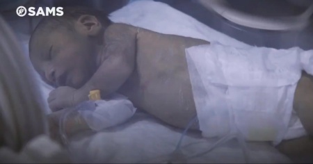 Il piccolo miracolato sta rispondendo bene ai trattamenti. «Lo stiamo solo nutrendo e stiamo intervenendo attraverso fleboclisi endovenose», ha detto il pediatra che lo ha in cura, il dottor Abdulkarim Hussein al-Ibrahim, che ha diffuso foto del piccolo dorme tranquillo all'interno di un'incubatrice con il polso collegato a una flebo.
