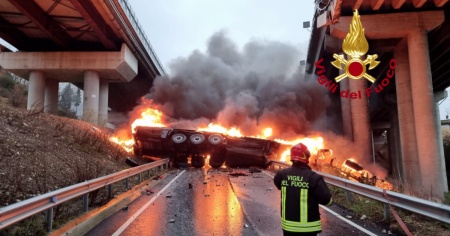 Il mezzo pesante ha quindi preso fuoco dopo l'impatto con il terreno. Le fiamme hanno avvolto sia la motrice che il semirimorchio, sul quale erano trasportati frutta e verdura. Per il conducente, un 56enne italiano, non c'è stato nulla da fare. I pompieri, giunti sul posto per domare il rogo con sette automezzi e tre squadre, non hanno potuto fare altro che constatarne il decesso. Le operazioni di spegnimento si sono concluse. Più complesse appaiono quelle di rimozione della carcassa dell'automezzo.