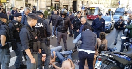 Il gruppo di sei giovani si è sdraiato per terra, in via del Tritone, impedendo alle auto di circolare liberamente. Gli attivisti si sono legati assieme con delle catene e, spogliandosi di felpe e magliette, sono rimasti seminudi fino all’arrivo della polizia.