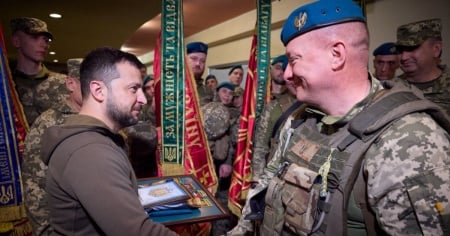 La presidenza ucraina ha pubblicato alcune immagini che lo ritraggono insieme ai comandanti e i soldati impegnati al fronte. Durante la visita, il presidente ucraino ha conferito alcuni riconoscimenti e premi al personale militare. Al termine dell'evento, i marines hanno consegnato a Zelensky la loro bandiera, le insegne e un targa commemorativa.