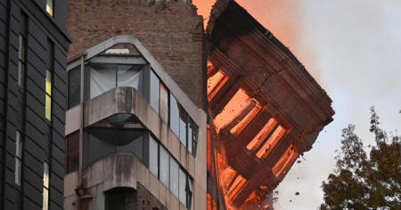 Il fuoco sta toccando anche diversi stabili nel vicinato e il primo palazzo sta cominciando a crollare a causa delle fiamme