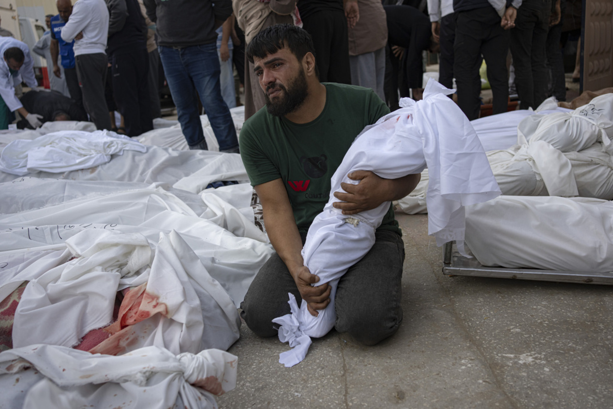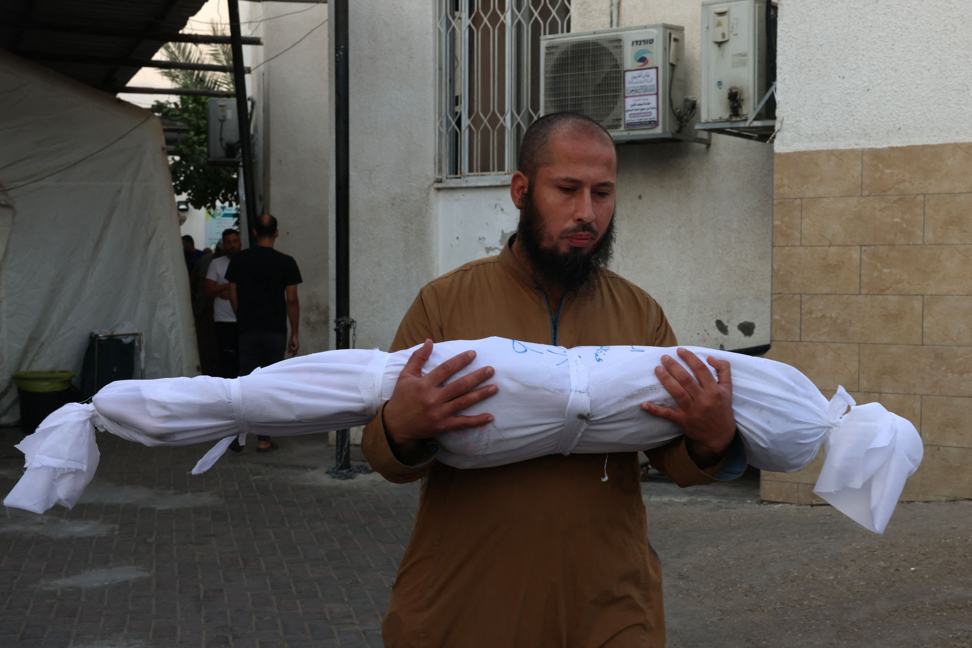Un padre palestinese trasporta il corpo, avvolto nel sudario, del suo bambino dopo gli attacchi israeliani notturni su Rafah, nel sud della Striscia di Gaza, 22 ottobre 2023