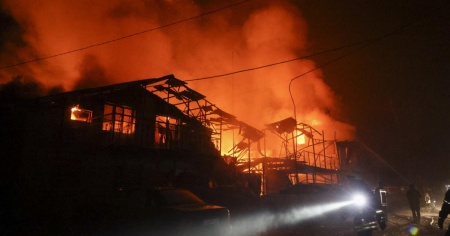 Sono stati lanciati almeno 10 velivoli senza equipaggio: per il momento non si segnalano vittime. Nel raid è stata distrutta una scuola, che ha preso fuoco, e sono stati registrati incendi anche in un edificio residenziale, una stazione di servizio e un edificio amministrativo. Danneggiati anche alcuni fabbricati agricoli.