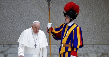 Il Papa è arrivato nell'Aula Nervi camminando a piedi con l'ausilio del solo bastone.
