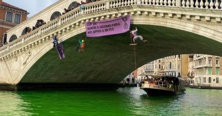 A Venezia è stato colorato di verde il Canal Grande. Alcuni attivisti si sono calati con corde e imbragatura dal ponte di Rialto esponendo uno striscione con la scritta "Cop28: mentre il governo parla noi appesi a un filo". Non sono mancati attimi di tensione, con centinaia di turisti che si accalcavano sulle rive del Canal Grande per fare foto e video dell'acqua verde.