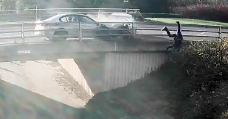 Proprio appena transitati sopra un cavalcavia, lo schianto con un'altra auto che sopraggiungeva (nel video da destra) è inevitabile. Il motociclista di circa 40 anni viene letteralmente catapultato giù dal ponte, riportando lesioni gravi. Altrettanto serie le ferite del passeggero dell'auto che si è trovato suo malgrado di fronte la moto e la BMW.
