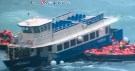 Il mare era mosso, l’imbarcazione aveva - come detto - 76 persone a bordo ed era «in fase di affondamento 4 miglia a largo di Grado (GO)». Tutti i passeggeri sono però stati portati in salvo sulle scialuppe, e poi trasbordati su «una motobarca VF per il successivo trasporto nel porto».