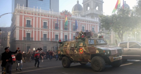 Il momento di massima tensione - Al culmine della tensione, a metà pomeriggio, mentre il presidente Luis Arce si mostrava in una trasmissione in diretta nel Palazzo del Popolo con tutto il suo gabinetto deciso a resistere al tentativo di golpe, le truppe al comando di Zuñiga hanno fatto irruzione nell'edificio con un blindato forzando il portone principale del palazzo.