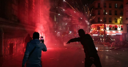 In serata, la festa è degenerata in violenza: stando a giornalisti di Le Figaro sul posto, le prime cariche della polizia sono avvenute a est di Place de la République, nei confronti di gruppi di individui incappucciati che cercavano di provocare gli agenti. Arredi urbani sono stati dati alle fiamme e sono state lanciati fuochi d'artificio e altri oggetti contro gli agenti che hanno risposto con gas lacrimogeni.