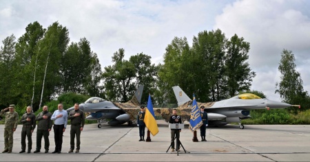 I giornalisti sul posto hanno visto almeno due F-16 sorvolare il sito durante la cerimonia. Dietro Zelensky, erano posizionati a terra altri due aerei grigi, somiglianti a F-16, parzialmente coperti. Il leader ucraino non ha specificato quanti caccia siano arrivati, ma secondo l'Economist i primi dieci (su un totale di 79 promessi) sono in Ucraina dall'ultimo giorno di luglio. Entro la fine dell'anno, Kiev dovrebbe averne a disposizione 20 in totale. Il resto, promesso da una coalizione di cui Danimarca e Paesi Bassi sono capofila, arriverà a lotti nel corso nel 2025.