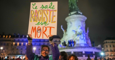 «Questo sporco razzista è morto» era scritto su un cartello mostrato nella folla di alcune centinaia di persone riunite in serata a Parigi in Place de la République. Fra i cori e gli slogan, mentre alcuni giovani si arrampicavano sul monumento al centro della piazza, quello del «vaffa dei giovani al Fronte nazionale».