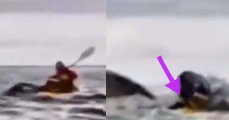 Nella bocca della balena, giovane in kayak se la vede brutta