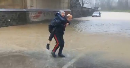 A Borgo San Lorenzo un'anziana rimasta intrappolata dentro la sua auto in un sottopasso allagato è stata tratta in salvo da un carabiniere che l'ha presa sulle spalle e portata via dal pericolo.