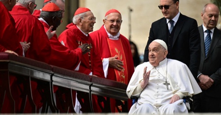 L'88enne è arrivato a Piazza San Pietro a conclusione della messa delle Palme, senza naselli per l'ossigeno. Ha salutato molta gente e regalato caramelle ai bambini. «Tutti abbiamo dolori, fisici o morali, e la fede ci aiuta a non cedere alla disperazione, non chiuderci nell'amarezza, ma ad affrontarli sentendoci avvolti, come Gesù, dall'abbraccio provvidente e misericordioso del Padre», scrive il pontefice nell'Angelus diffuso, per la nona domenica consecutiva, solo con un testo scritto.