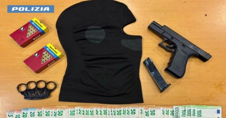 I poliziotti, a seguito di perquisizione, hanno rinvenuto e sequestrato, all’interno della borsa di proprietà del 19enne, una pistola scacciacani con un colpo a salve in canna, il relativo serbatorio con altri 2 colpi sempre a salve, 2 scatole di proiettili, 2.250 euro in contanti e un passamontagna. In possesso di quest’ultimo, indagato in stato di libertà insieme ad un complice 18enne che invece è stato trovato con un tirapugni, è stata rinvenuta dai poliziotti la collana strappata poco prima ad una delle vittime. Infine, gli agenti, per identificazione, hanno accompagnato in Questura anche un 16enne cittadino egiziano trovato insieme al gruppo.