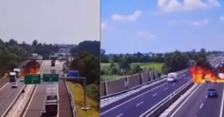 Nelle immagini, ripresa dal sistema di telecamere di videorsorveglianza autostradale, si vede chiaramente il piccolo aeromobile - un Promecc Aerospace Freccia - che precipita sull'asfalto, trasformandolo in un inferno di fuoco e lamiere metalliche.