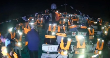Sui suoi canali social, la FFC pubblica un video che mostra diversi attivisti su una barca con le mani alzate e con indosso i giubbotti di salvataggio.