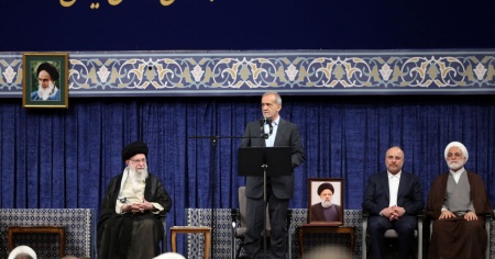 Poi ha espresso fedeltà alla suprema carica: «Mi impegno a perseguire questi obiettivi nella cornice fissata dal leader Ali Khamenei, in concordanza con gli insegnamenti dell'Islam e con il pensiero del defunto fondatore della Repubblica islamica, Ruhollah Khomeini», ha detto Pezeshkian, citato dalla Tv di Stato.