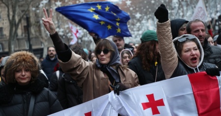 Dopo l'ingente catena umana di ieri, diverse migliaia di georgiani, avvolti da bandiere nazionali e dell'Unione europee, hanno manifestato sin dalla prima mattina, attorno al Parlamento, dove si è tenuta la cerimonia solenne del giuramento del neopresidente. Tanti di loro avevano in mano un cartellino rosso, un chiaro riferimento al passato calcistico di Kavelashvili.