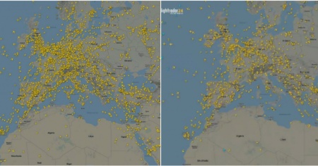 Nei cieli europei la differenza è notevole. E lo si può constatare dalle immagini fornite dal servizio Flightradar24 che si riferiscono al 18 marzo del 2020 e al medesimo giorno del 2019: sono molti meno gli aerei rilevati dai radar.
