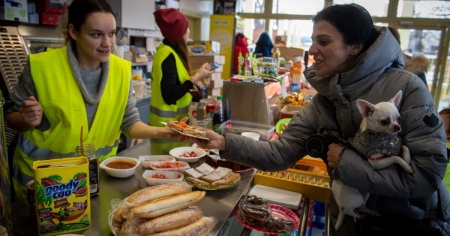 Volontari offrono cibo ai rifugiati ucraini, in Slovacchia.