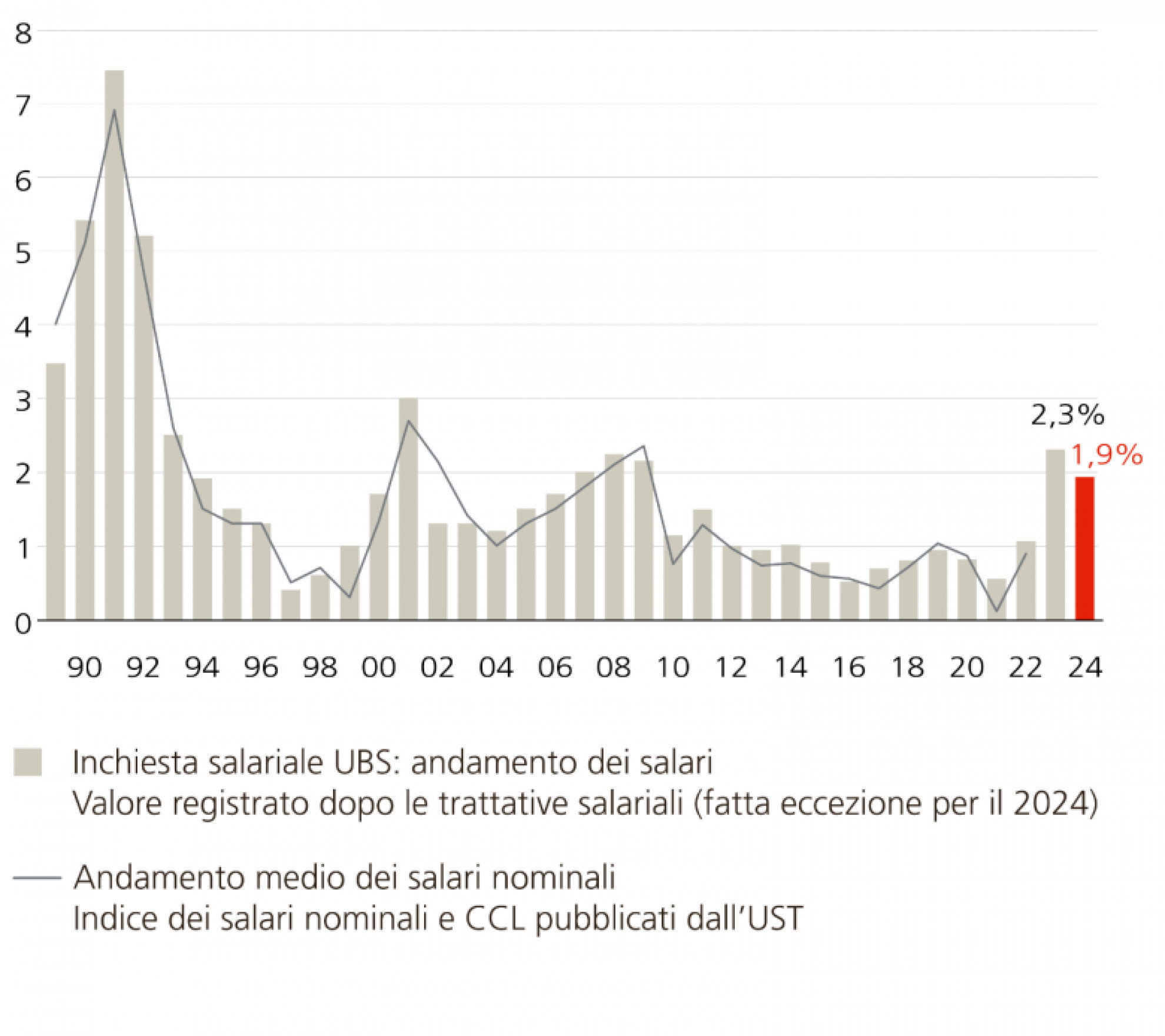 Per ciascuno dei 22 settori intervistati risulta un aumento del salario nominale sia per il 2023 che per il 2024. Nel 70% dei casi, stando a UBS, è prevedibile un incremento del salario medio del 2%.