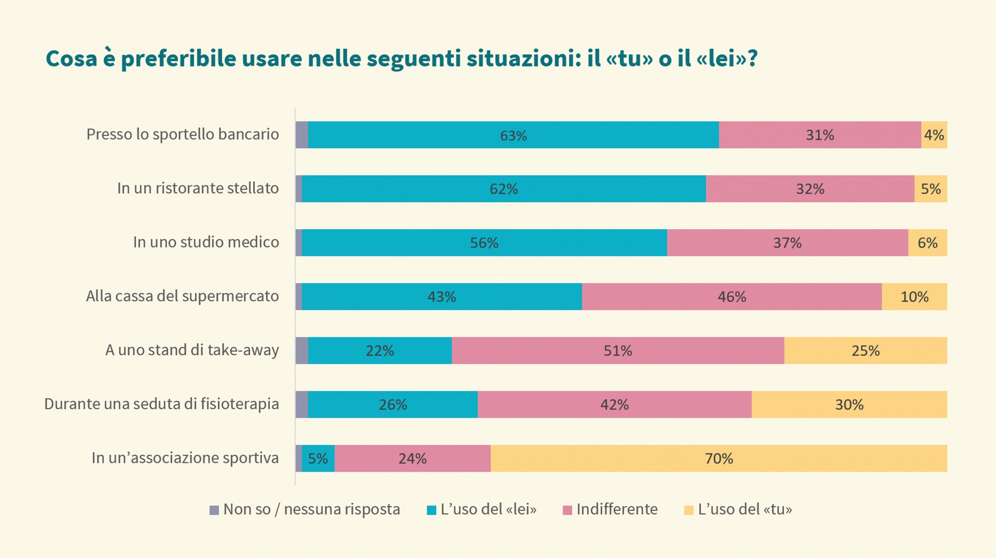 Il contesto ha un peso maggiore rispetto all’età - Dall'indagine emerge che a influire sull'atteggiamento personale nei confronti del «tu» non è tanto l'età, quanto il contesto di comunicazione: affinché il «tu» risulti appropriato è necessario infatti che vi sia un clima collegiale, informale e disinvolto. In concreto significa che in un'associazione sportiva il «lei» viene preferito da appena una persona su venti, mentre in negozio da asporto si passa già a una persona su cinque, a quasi una su due alla cassa del supermercato e a due terzi delle persone intervistate, quando si tratta di sportelli bancari.