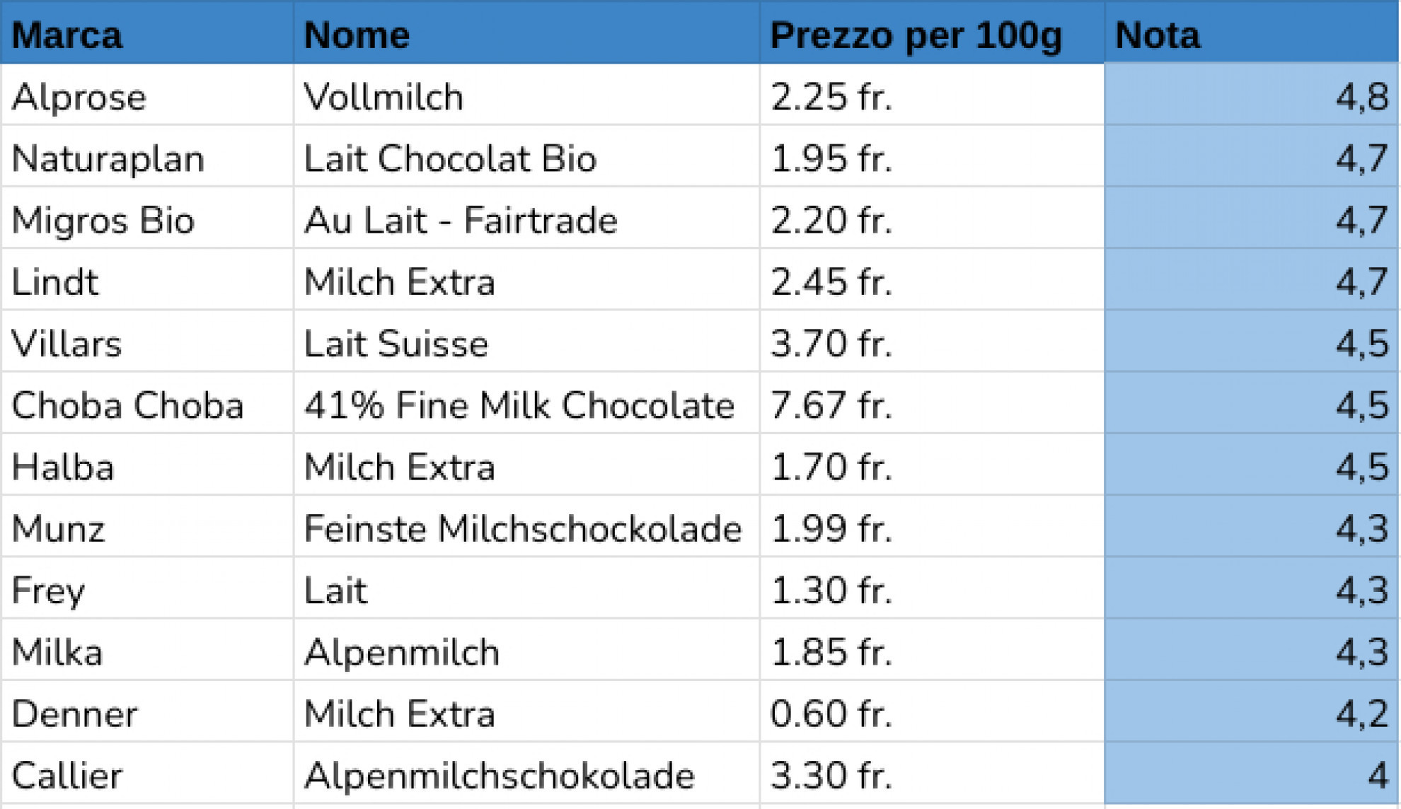 All'ultimo posto, abbastanza a sorpresa, un marchio rinomato: Cailler che si porta a casa giusto una sufficienza (4). Il motivo: «È troppo dolce, e con una nota granulosa sul palato», sentenziano i giurati.