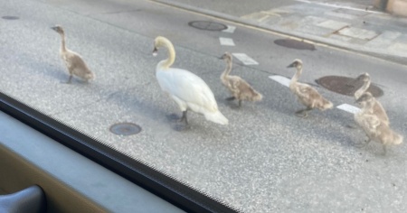 Quando l'ingorgo lo provoca... una famiglia di cigni "in gita"