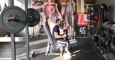 Da questa posizione spingete in alto i manubri portandoli fin sopra la testa estendendo completamente i gomiti. Durante la spinta mantenete i manubri paralleli tra loro (avambraccio in posizione neutra) con una rotazione esterna parziale dell’omero. L’eventuale rotazione dei manubri è del tutto irrilevante in quanto è conseguenza della pronazione dell’avambraccio che è un movimento ininfluente per la stimolazione del deltoide e del trapezio.