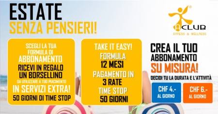 Approfitta dello SPECIALE ABBONAMENTO SU MISURA, scegli tu la durata del tuo abbonamento e le attività che vuoi inserire nel tuo percorso personalizzato, con soli CHF 4.- al giorno potrai allenarti senza stress e deciderai tu la durata del tuo allenamento in base alle tue specifiche esigenze, puoi decidere che percorso fare (fitness, piscina o entrambe) e quanti giorni deve durare l’abbonamento!