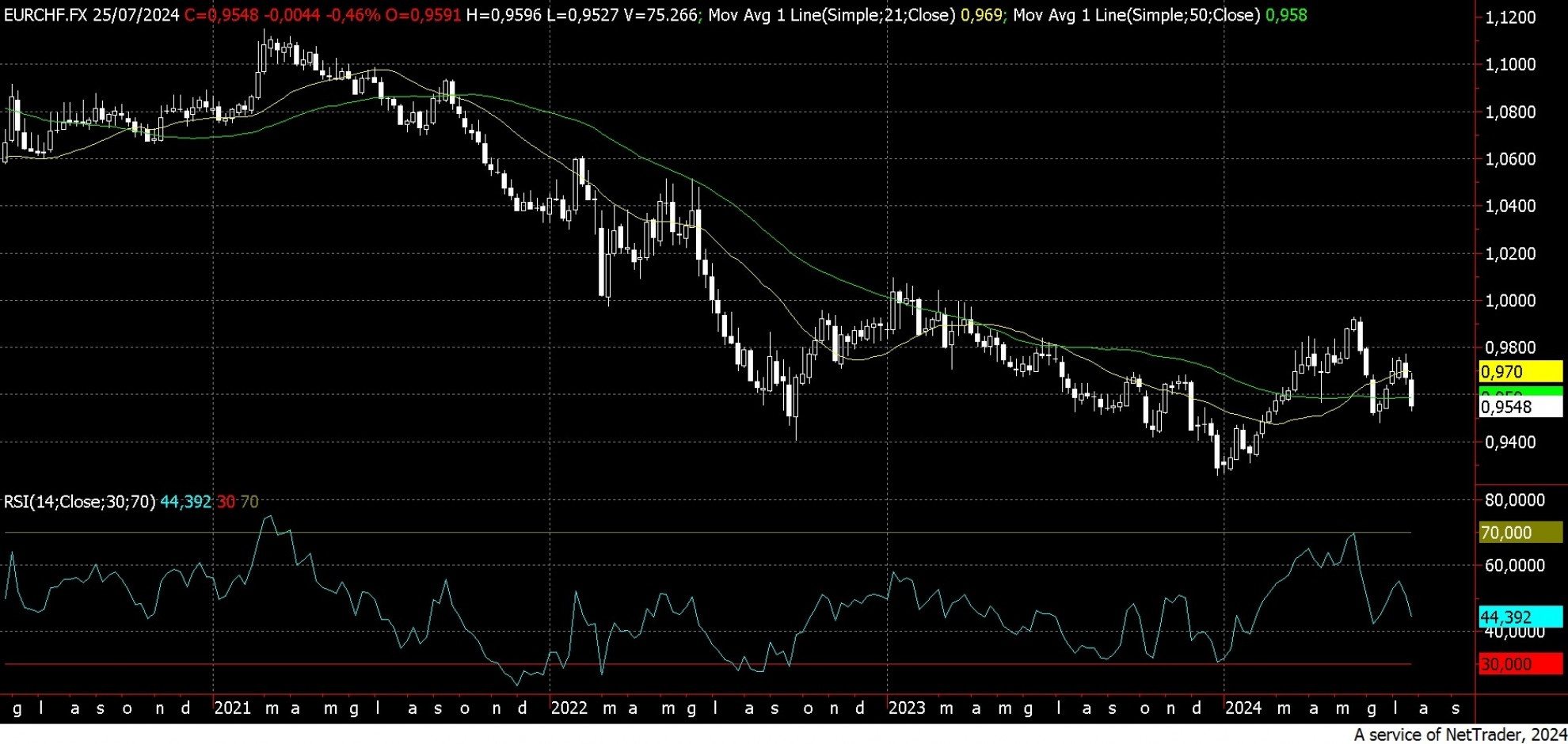 In caso contrario, se il supporto in zona 0,948 dovesse cedere, gli obiettivi si sposterebbero prima a quota 0,940 e poi, eventualmente, ai minimi di fine 2023/inizio 2024 a 0,925.