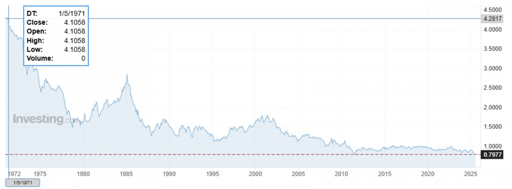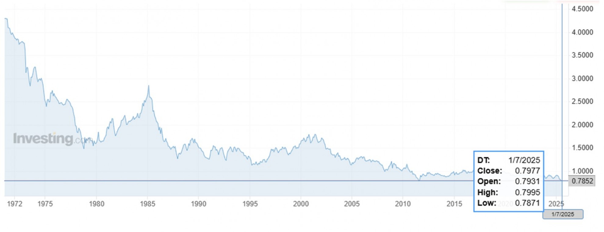 Andamento del cambio tra Dollaro e Franco Svizzero (USD/CHF) nel lungo termine – Fonte Investing.com _ Grafico tasso di cambio USD/CHF dal 5 gennaio 1971 al 7 gennaio 2025