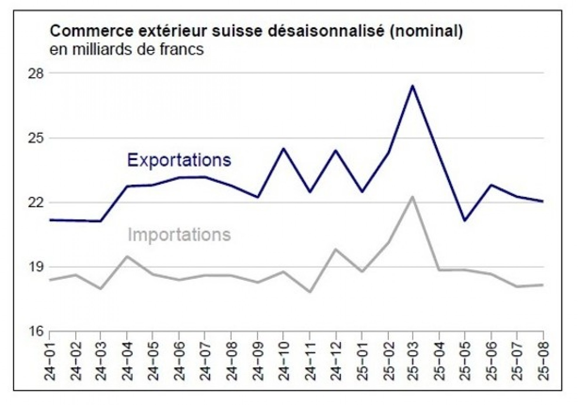 La Svizzera chiude l’estate con un bilancio commerciale debole, confermando una tendenza negativa che si protrae da mesi. Secondo l’Ufficio federale della dogana e della sicurezza delle frontiere (OFDF), ad agosto le esportazioni sono scese dell’1% in termini nominali, attestandosi a 22 miliardi di franchi, mentre in termini reali si è registrato un lieve progresso del +2,4%. Le importazioni hanno mostrato una leggera ripresa (+0,4%), raggiungendo 18,1 miliardi di franchi. L’avanzo commerciale si è così ridotto a 3,9 miliardi, uno dei più bassi dell’ultimo anno.