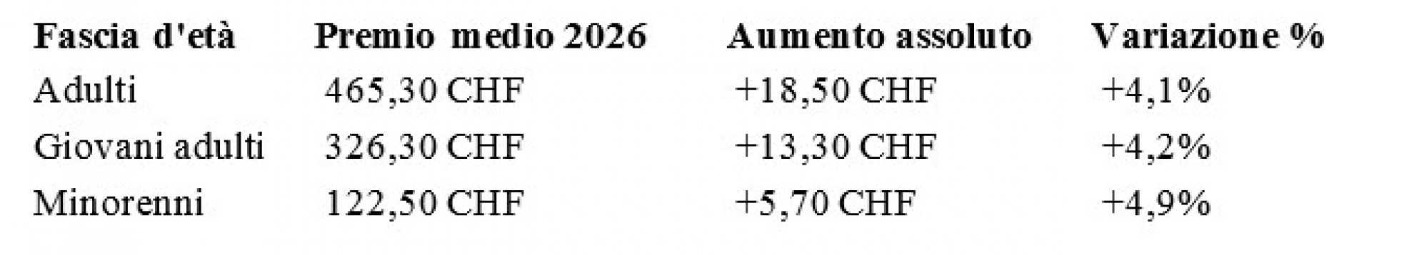Nel 2026, i premi dell’assicurazione malattia in Svizzera subiranno un nuovo incremento. Il premio medio mensile raggiungerà 393,30 franchi, con un aumento del 4,4% rispetto al 2025. La variazione — pari a +16,60 franchi al mese — riflette l’aumento continuo dei costi sanitari, legato a fattori strutturali come l’invecchiamento della popolazione e l’introduzione di nuove terapie.