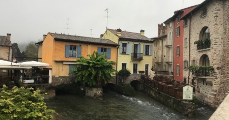 Le poche case che costituiscono il borgo, gli antichi mulini e il fiume si fondono in un un unico scenario suggestivo, qualcosa di decisamente unico al mondo. A fare da cornice il ponte Visconteo, una diga fortificata costruita nel 1393 per volere di Gian Galeazzo Visconti e il castello Scaligero che domina la valle del Mincio dall’alto della sua collina. L’acqua è la protagonista assoluta e si integra perfettamente con gli edifici con cui convive.