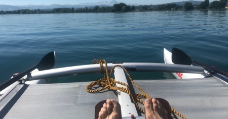 Quello che mi ha davvero impressionato è il canotaggio flessibile: classico e con di voga in avanti brevettato. Ci sono state più di 250 domande di brevetto per sistemi di voga in avanti nel corso degli ultimi 100 anni. Nessuno di loro è veramente utilizzabile, perché la tornitura della lama non funziona sufficientemente o non esiste affatto. Solo quando si mettono in discussione le cose che sono sempre state così come sono, si arriva a innovazioni che fino ad ora molti non credevano potessero essere migliorate. Gli scull forward rowing “RowVista” offrono le stesse prestazioni del canottaggio classico. Un arresto regolabile fornisce la limitazione della corsa verso la parte posteriore e rende possibile la voga senza cinghie per i piedi. Molto comodo per chi ama remare a piedi nudi in estate. I tacchetti con meccanismo a scatto, che sono regolabili senza attrezzi, sono fissati alle travi laterali. Il sedile a rulli scorre tranquillamente sulla trave centrale con sei cuscinetti a sfera. La tavola del manubrio, che viene fatta scorrere sulla trave centrale, è regolabile in 5 posizioni per un assetto ottimale del peso.