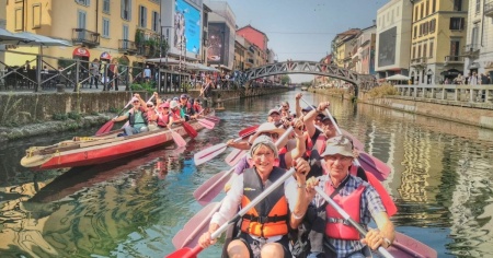 Il Naviglio, con la sua lunghissima storia, l’abbiamo affrontato a bordo di due barche della Canottieri San Cristoforo di Milano. Sotto l’attenta guida di Simone, abbiamo percorso il tratto fino alla “conchetta di Leonardo”, pagaiando allo stesso ritmo, scoprendo l’interessante storia delle vie d’acqua e attirando naturalmente l’interesse del pubblico accorso sui ponti e sull’Alzaia. Indubbiamente un’occasione imperdibile per capire che nei prossimi otto giorni saremo tutti sulla stessa barca.