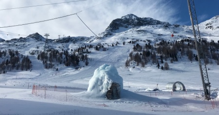 Se l'acqua di fusione del ghiacciaio, che si accumula in massa in estate, fosse raccolta il più in alto possibile, riciclata sotto forma di neve in inverno e quindi restituita al ghiacciaio, lo scioglimento del ghiacciaio potrebbe essere ritardato - è nato il termine "riciclaggio dell'acqua di fusione". Cosa succede quando copre i ghiacciai con la neve? Questa era una domanda centrale che il glaciologo Felix Keller dell'Academia Engiadina di Samedan, insieme a Johannes Oerlemans dell'Università di Utrecht (NL), aveva posto dal 2015 per conto del comune di Pontresina. Seguirono numerosi studi e prove sul campo nell'Alta Engadina e fu realizzato uno studio di fattibilità computazionale che fu pubblicato scientificamente. Il risultato di questo studio è concretamente visibile nell’impianto modello costruito davanti alla strazione (riprodotto anche nella foto).