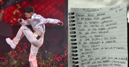 «Cadono fiori, Ariston», debutta con queste parole la lettera del 19enne. «Si spezzano fiori, Ariston Cala il sipario, Ariston Ti ho messo in lacrime come la mia mamma, Ariston Mi hai visto fragile come un bimbo e qui proprio qui, dove mi hai insegnato a correre, sono caduto... Mi sono rotto la faccia e piango Ariston Ma poi... Rido, rido, rido, rido, rido, rido e quindi perché non sono perfetto come mi volevi ma finalmente sono me stesso. Ti voglio bene Ariston con tutta la mia follia».