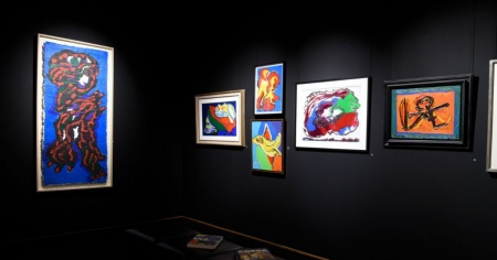 Una piccola mostra, con una decina di opere, sufficiente tuttavia per introdurci al colorato mondo di Karel Appel, olandese e fondatore nel 1948 del gruppo Co.Br.A (dalla iniziali di Copenaghen, Bruxelles e Amsterdam, le città dalle quali provenivano i principali artisti del gruppo). Nell’ambito del gruppo Co.Br.A, Appel è tra i fautori di una vera e propria rivoluzione artistica, che si prefigura come un ritorno a un primitivismo infantile e un abbandono delle rigidità formali e razionali dell’epoca precedente: ne conseguono opere figurativo-gestuali, realizzate con pennellate di getto e materiche, colori violenti, nelle quali abbondano riferimenti alla cultura, ai miti ancestrali e alle leggende dei paesi nordici. Opere che ci accompagnano direttamente nel mondo interiore dell'artista, che - come lo stesso Appel amava sottolineare – dovrebbe relazionarsi con il mondo esterno con lo stesso spirito di un “bambino interrogante”, libero cioè dalle rigidità e dai dogmi del mondo degli adulti.