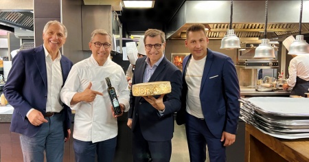 Lo chef Domenico Ruberto ha donato ai fratelli Roca anche l’olio prodotto dalla sua famiglia in Calabria, spiegando loro la filosofia del ristorante gastronomico dello Splendide, I Due Sud, che unisce le eccellenze gastronomiche del sud della Svizzera e del sud Italia, creando un unicum per la piazza gastronomica luganese.