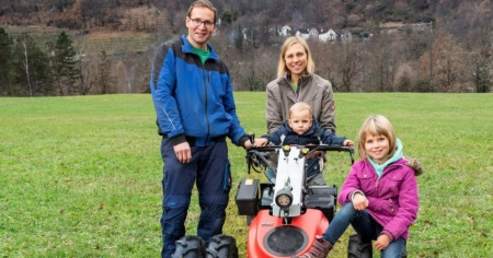 Foto (Mahler): Attorno alla nuova e fiammante falciatrice c’è la famiglia Bachmann con papà Jonatan e mamma Sabrina, i piccoli Irina e Naele in futuro forse si posizioneranno alla guida.