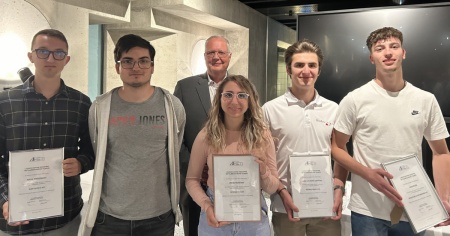 Nella foto: il presidente AMETI Sergio Pedrazzini con gli apprendisti premiati Aron Maggisano, Ruben Barros Freitas, Irene Mustone, Alan Cavadini Garrido, Sven Rossi.