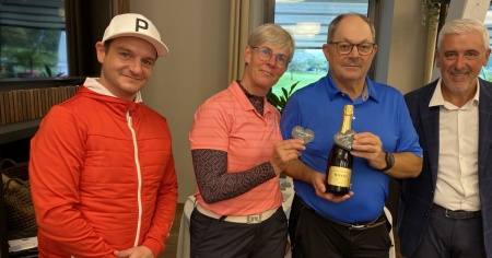 Nella foto da sinistra: Damiano Cossi, Capitano Golf Gerre Losone; i vincitori dei premi nearest to the pin alla buca 2 Tina Boyschau e Stefano Bignasca e Leonardo Pinoja (Presidente Golf Gerre Losone)