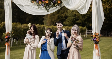 Non possono mancare accessori spiritosi come cappellini, parrucche, occhiali buffi, baffi finti e cornici in stile retrò. L'idea in più è quella di far realizzare una cornice personalizzata con i vostri nomi e la data delle nozze, sulla quale i vostri amici e parenti potranno lasciare una loro dedica.