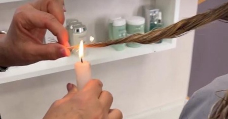 Per effettuare la bruciatura delle doppie punte dividiamo i capelli asciutti in sezioni e creiamo con le ciocche dei torchon: attorcigliando i capelli, punte secche e doppie si posizionano all’esterno. A questo punto facciamo scorrere la fiamma di una candela sull’intera lunghezza, partendo dalle punte per poi raggiungere la parte superiore della testa.