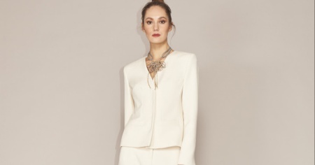 MILANO - Non un bianco luminoso, ma un bianco caldo, nella tonalità del panna. E non un modello qualsiasi, ma uno in cui i tagli sartoriali precisi e la perfetta vestibilità sono esaltati dalla luce del tessuto chiaro in cui è realizzato.