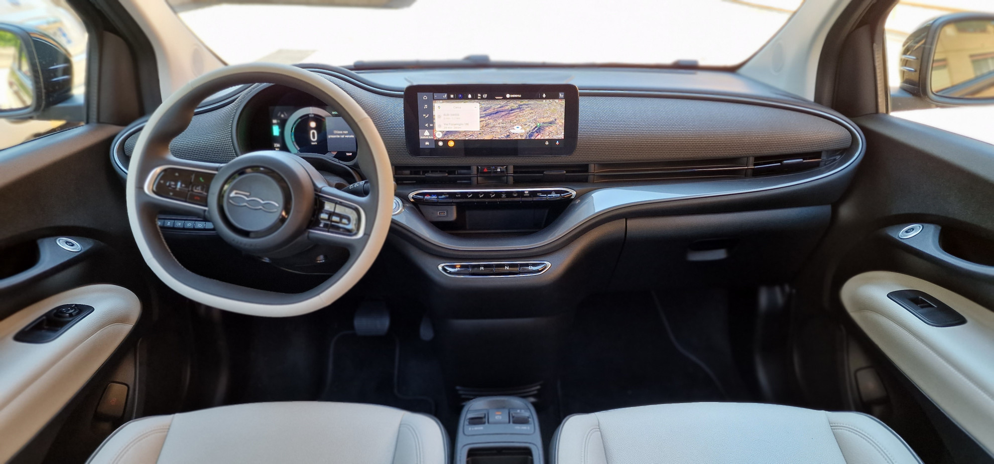 In città abbiamo apprezzato molto la guida One Pedal che consente di gestire accelerazione e decelerazione agendo sullo stesso pedale: al rilascio il recupero di energia è massimo e questo fa decelerare la vettura fino all’arresto completo. Le tre modalità di guida rendono questa vettura molto versatile. Con la modalità Normal l’auto si comporta come un qualsiasi mezzo a combustione interna con cambio automatico, ma con la sorpresa delle prestazioni: 87 kW di potenza pari a 118 CV, 220 NM di coppia, disponibile in modo istantaneo e accelerazione da auto sportiva da 0 a 50 km/h in 3 secondi e 1, e da 0 a 100 in 9 secondi. Nella modalità Range, la Nuova 500 offre invece la possibilità di guidare con un piede solo. Questo stile, ideale per l’uso urbano, consente un elevato recupero di energia. Quando l’autonomia è al minimo si può passare alla modalità Sherpa che consente infine al guidatore di arrivare a destinazione ottimizzando le risorse disponibili. Interviene su più elementi per ridurre al massimo il consumo energetico della vettura, proprio per assicurare il raggiungimento della destinazione impostata sul navigatore o della colonnina di ricarica più vicina.